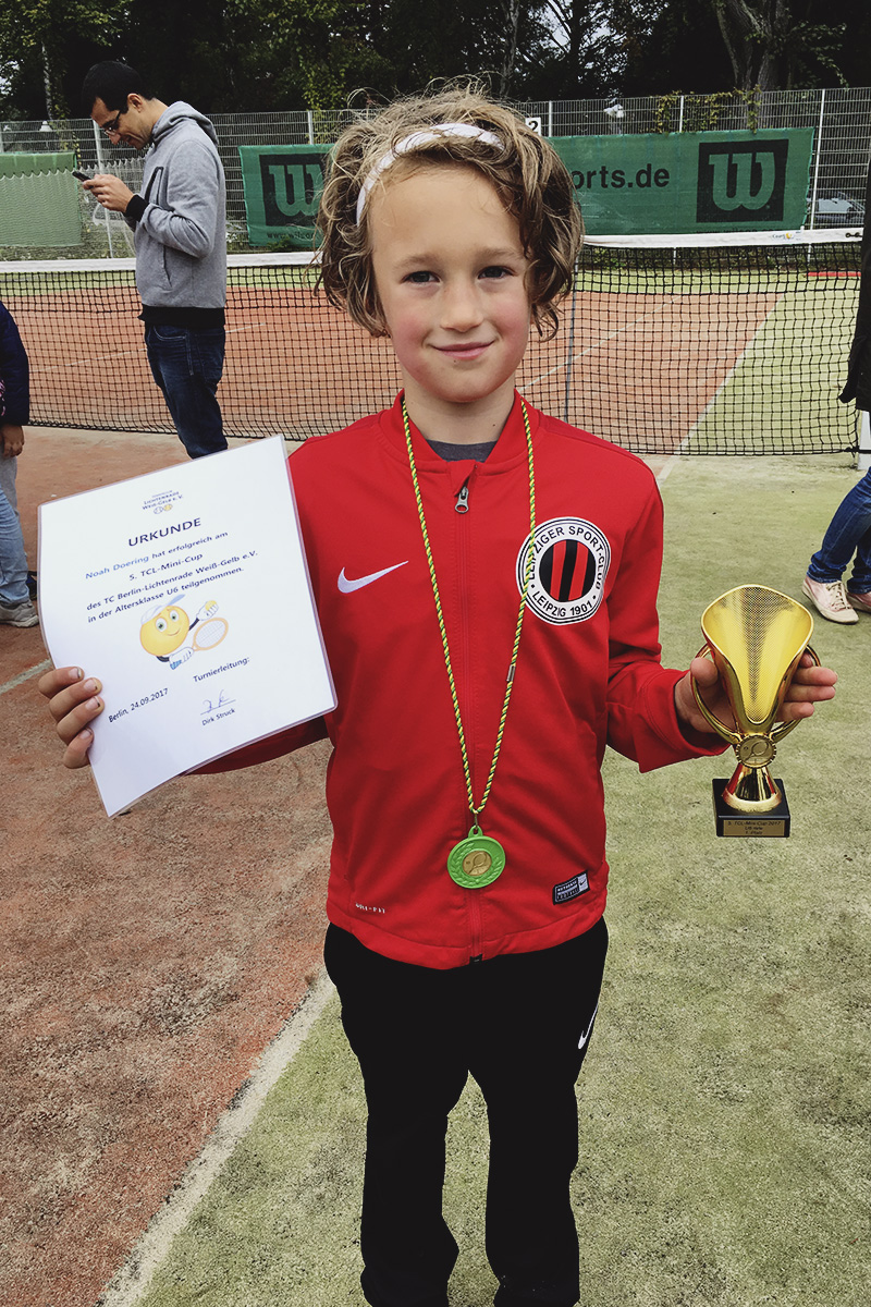 Das erste Halbfinale bestritt Noah gegen den Potsdamer Michail Khotsin. Absolut motiviert und mit vollem Kampfeinsatz konnte Noah beide Sätze mit 4:2/4:2 für sich gewinnen und sich das Ticket ins Finale sichern. Auch Johann lief zur Höchstform auf und rannte mit vollem Einsatz von Ball zu Ball. Dies wurde mit einem 4:3/4:2 und ebenfalls mit dem Einzug ins Finale belohnt. Im Finale spielte Noah dann in der U6 gegen Zino Mare Matijevic vom Dahlemer Tennisclub, welcher vorab noch kein Match des Turniers verlor. Hier konnte sich Noah mit Strategie und seinen letzten Kräften mit 4:3/4:2 den Sieg sichern. Johann stand im Finale der U7 dem Gegner Nick Ehmer vom TC Weiß-Gelb Lichtenrade gegenüber. Hier hatte es Johann nicht leicht, kämpfte aber wie ein Großer um jeden Punkt. Mit einem Endergebnis von 4:2/4:0 konnte er sich den 2. Platz sichern. Hochachtung für die tollen Leistungen und weiter so!