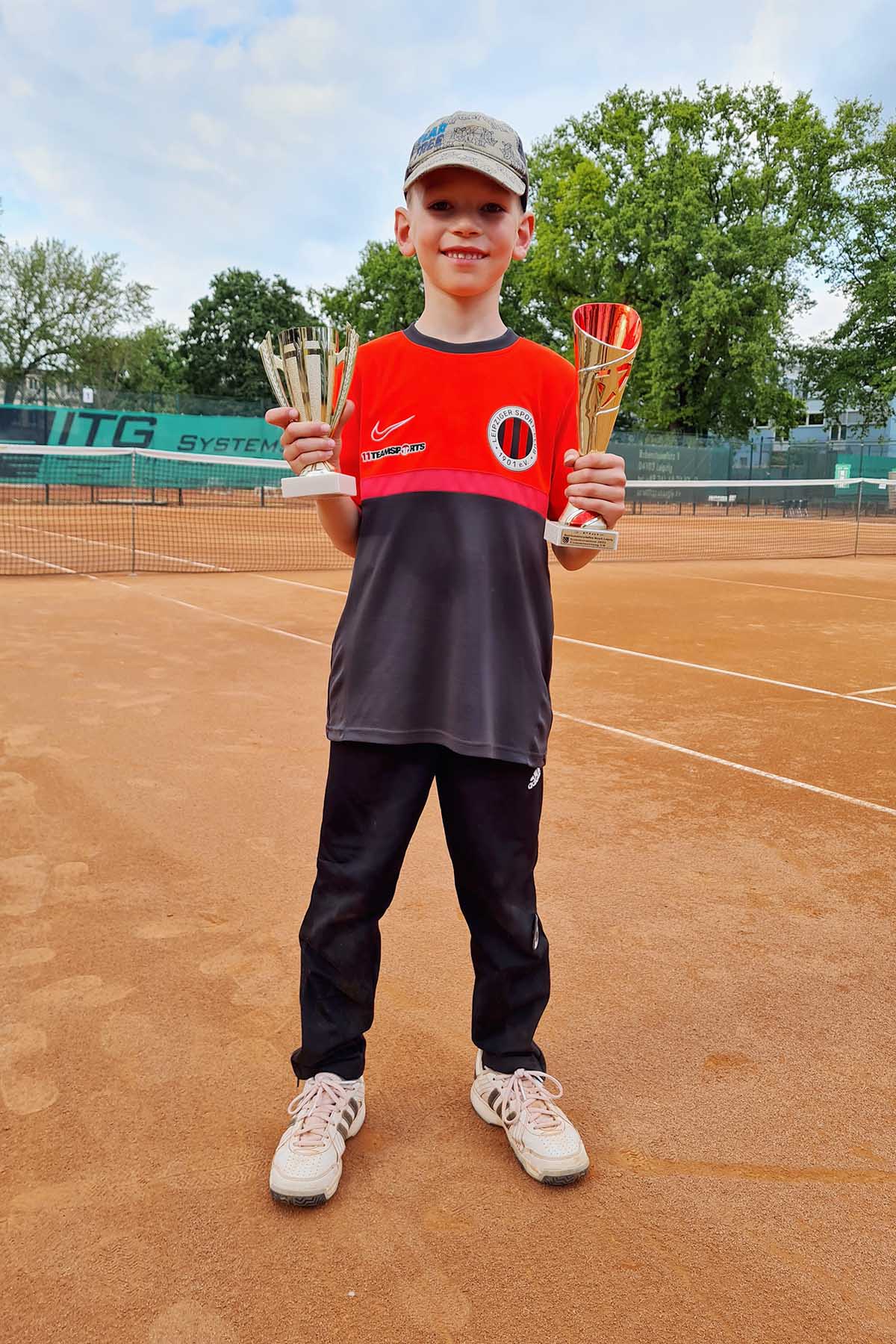 Bei den Jungen der Altersklasse U12 starteten 5 unserer Sportler: Ognjen Kritinic (LSC 1901) gewann sein erstes Spiel und durfte dann gegen seinen Trainingskollegen und an den Position 1 gesetzten Tom Ochotzki (LSC 1901) antreten. Ogi spielte einen sehr guten ersten Satz und verlor diesen knapp mit 5:7. Im zweiten Satz war die Luft etwas raus und Tom konnte sich deutlich mit 6:0 dursetzen. Noah Doering (LSC 1901) spielte ein gutes erstes Match gegen den an 4 Gesetzten Zhinos Shirzady, das er mit 6:2/6:1 für sich entschied und schlug dann seinen Trainingskollegen Leopold Kuprian (LSC 1901) mit 6:2 /7:5. Leopold gewann zuvor sein Erstrundenmatch deutlich mit 6:0/6:1. Noah traf dann im Halbfinale auf Tom, dem er deutlich mit 0:6/0:6 unterlag und schloss damit das Turnier als Dritter ab. Maximilian Himmel musste leider krankheitbedingt absagen und so spielte sich unser an 2 gesetzter Johann Hecht ganz in Ruhe ins Finale. Auf seinem Weg besiegte er Julius Wagner und Emil Kühne deutlich. Im Finale traf er dann auf Tom. Vor allem im ersten Satz war das Match der beiden Finalisten lange auf Augenhöhe. Johann versuchte das Spiel in die Hand zu nehmen, doch Tom blieb ruhig und überzeugte mit einem soliden Grundlinienspiel. Am Ende hieß es 6:4/6:2 für Tom, der sich verdient den Titel holte!